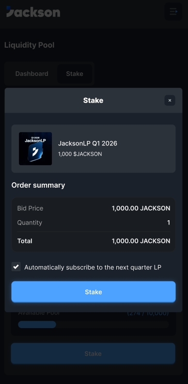 3. Confirm: The system operates on a first-come, first-served Dutch auction format. Once confirmed, the $JACKSON balance is deducted, and the LP certificates are minted to your wallet.