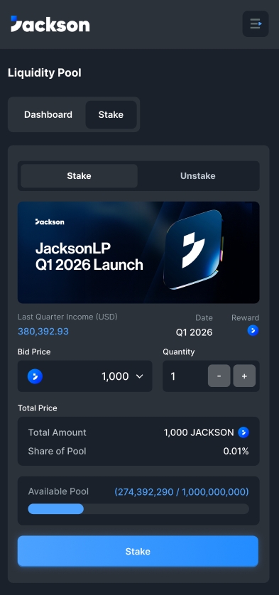 Staking and Liquidity Certificate NFT Participants who stake the approved digital asset ($JACKSON) into the JacksonLP smart contract shall receive a tradable "Liquidity Certificate NFT" (Yield Certificate). This NFT certificate represents the holder's capital share and future yield entitlement within the liquidity pool. It can be freely transferred on secondary markets, thereby providing liquidity without mandatory waiting until the lock-up period expires.