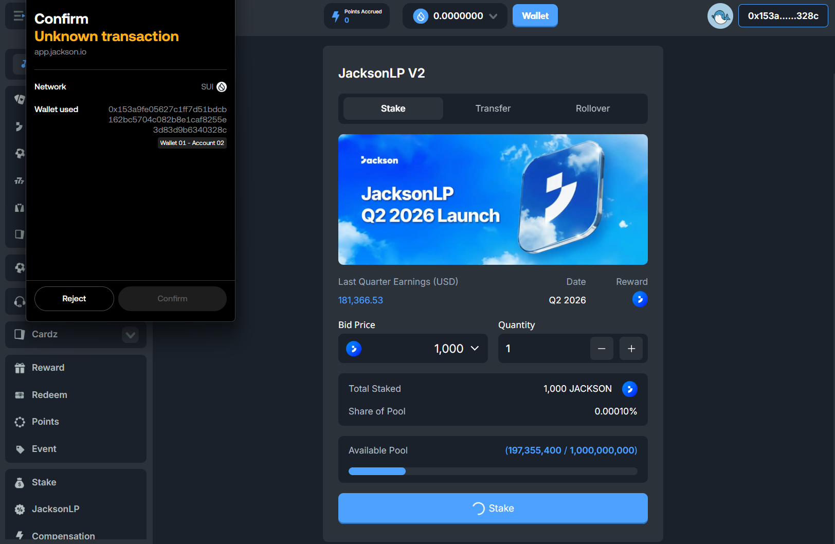 Enter the amount of $JACKSON you wish to stake, confirm the transaction, and complete the on-chain operation. This must be completed within the staking window.