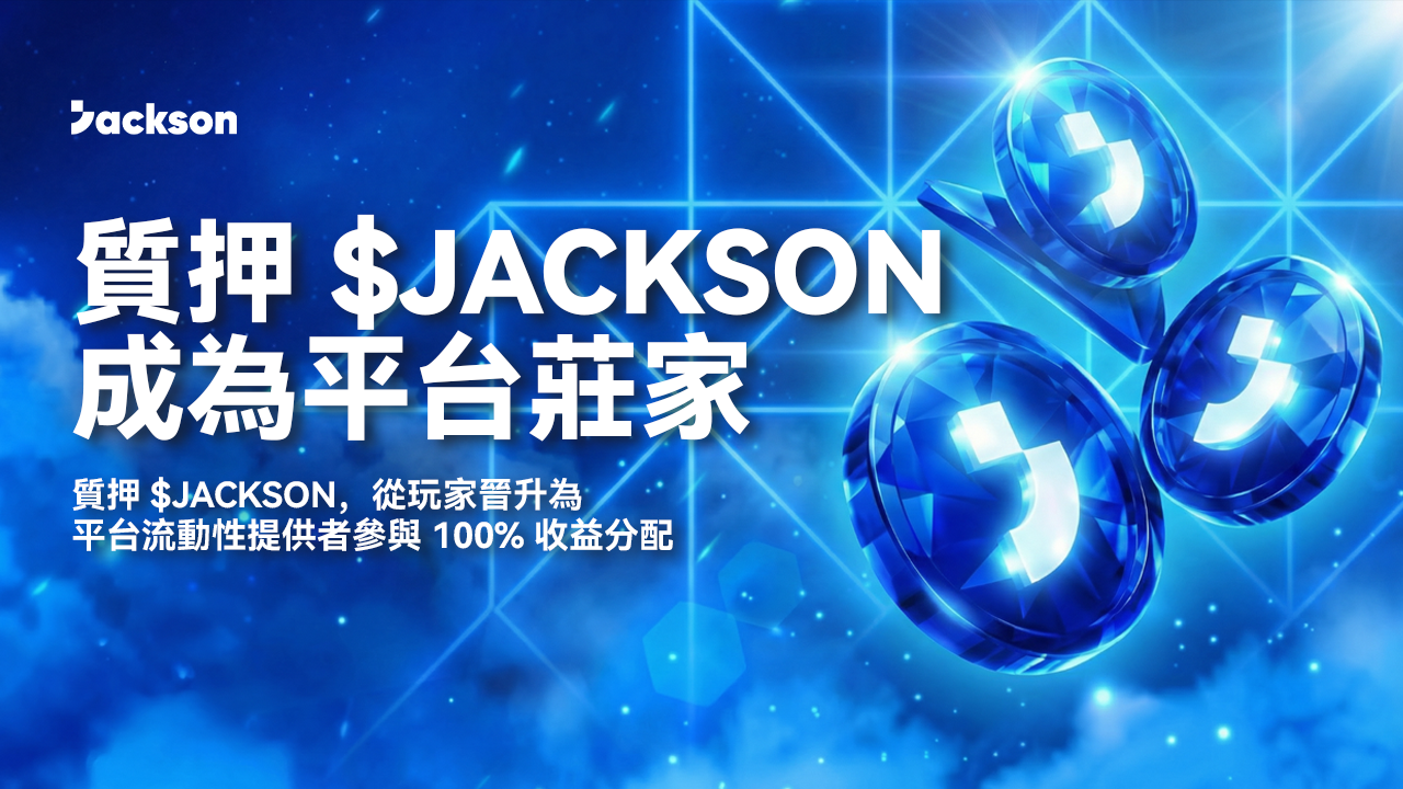 用戶可透過質押 $JACKSON 成為平台流動性提供者(即莊家),參與整體遊戲盈虧分配。質押後,將按比例瓜分平台 100% 盈虧結果,平台僅作撮合角色。此機制讓用戶由單一玩家角色,轉變為平台流動性提供者之一。